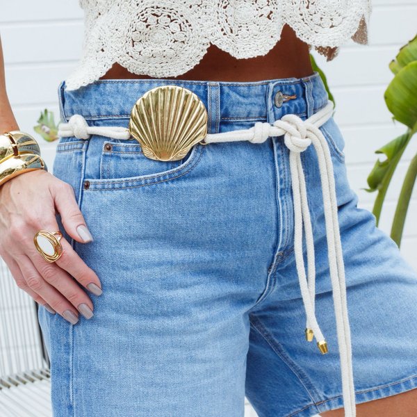 O Cinto Corda Concha Dourada é o acessório perfeito para compor looks com charme praiano e toque sofisticado. Feito em corda natural com ponteiras metálicas, traz como destaque a fivela em formato de concha dourada, que adiciona brilho e personalidade à produção. Ideal para usar com vestidos, saias ou shorts, elevando o visual com elegância despretensiosa.