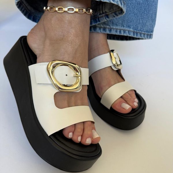 Papete Flatform Iza na cor off white, com tiras largas e fivela ajustável para praticidade e segurança. O solado flatform garante conforto e um toque moderno, ideal para compor looks casuais com personalidade.