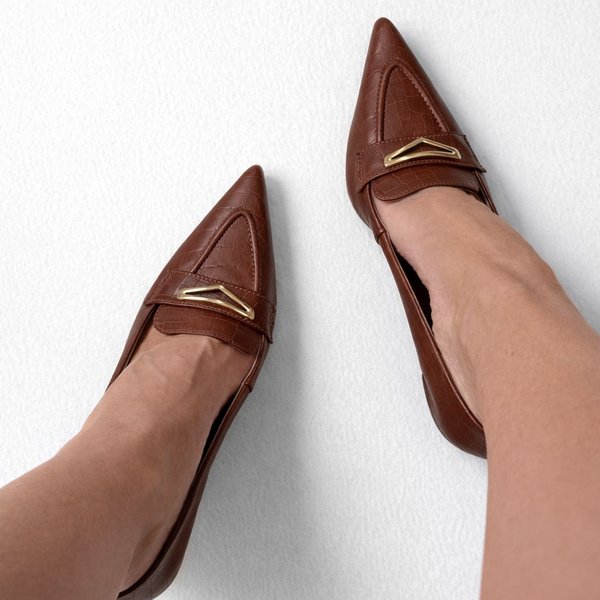 Clássico e refinado, o Scarpin Nora em tom caramelo traz a sofisticação do bico fino combinada com a textura croco, que adiciona personalidade e modernidade ao design. O detalhe metálico dourado na parte frontal eleva o modelo, trazendo um toque de luxo discreto e atemporal. O salto médio garante conforto e estabilidade, perfeito para acompanhar você do trabalho a compromissos especiais com elegância.