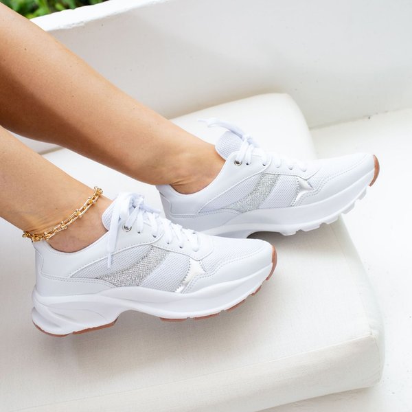 O Tênis Amanda na cor branca ganha um toque especial com detalhes em glitter, unindo praticidade e estilo. Versátil e moderno, é perfeito para dar um ar fashion a produções casuais, garantindo conforto durante todo o dia.