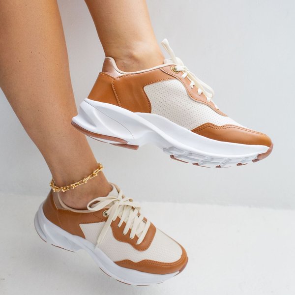 Tênis chunky Madrid em tom caramelo e off-white: a combinação perfeita entre atitude e sofisticação para o dia a dia. Com acabamento em material sintético de alta qualidade, recortes perfurados que garantem respirabilidade e detalhe metalizado no calcanhar, este modelo une visual moderno a um design pensado para o conforto.