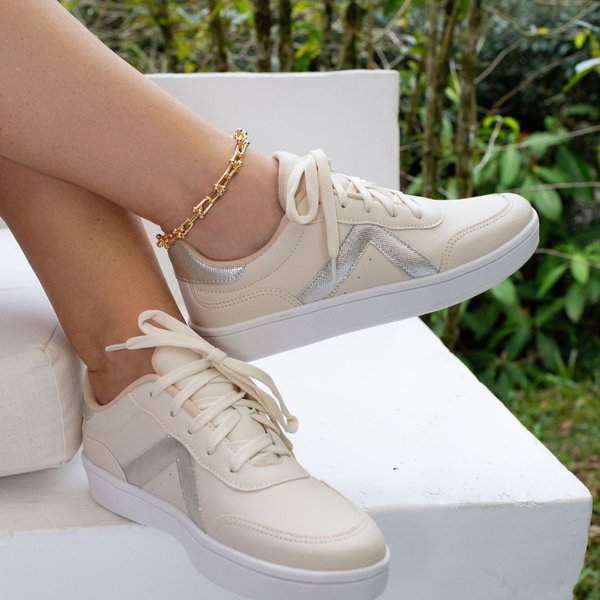Elegância e conforto em cada passo! O tênis Roma bege com detalhe prateado é perfeito para quem busca um visual moderno e delicado ao mesmo tempo. Seu design clean com toque metalizado traz um charme sofisticado, ideal para compor desde looks casuais até produções mais estilosas. Confeccionado em material sintético macio e resistente, proporciona conforto durante todo o dia e fácil combinação com diversas peças do guarda-roupa.